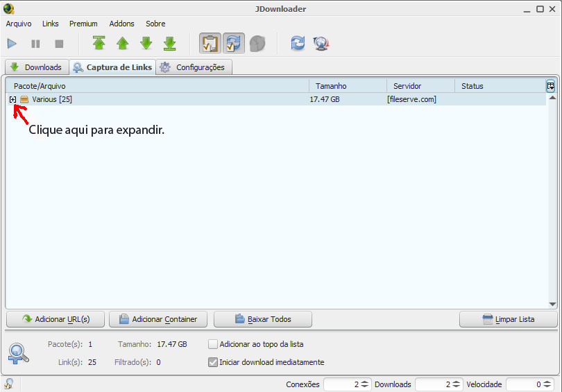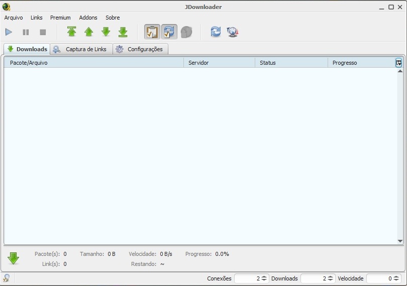 Após a instalação execulte o JDownloader e terá uma tela como essa: