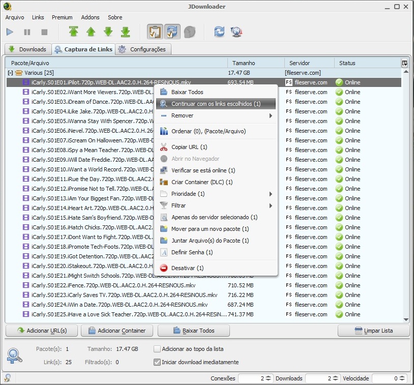 Para baixar os episodios HD, é nesesario o JDownloader.